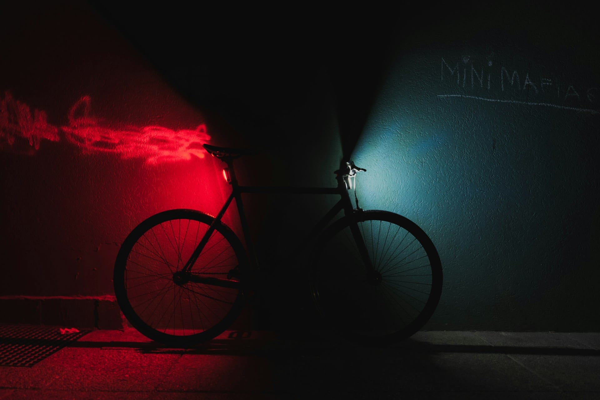 Vélo dans le noir avec un éclairage rouge à l'arrière et un éclairage blanc à l'avant