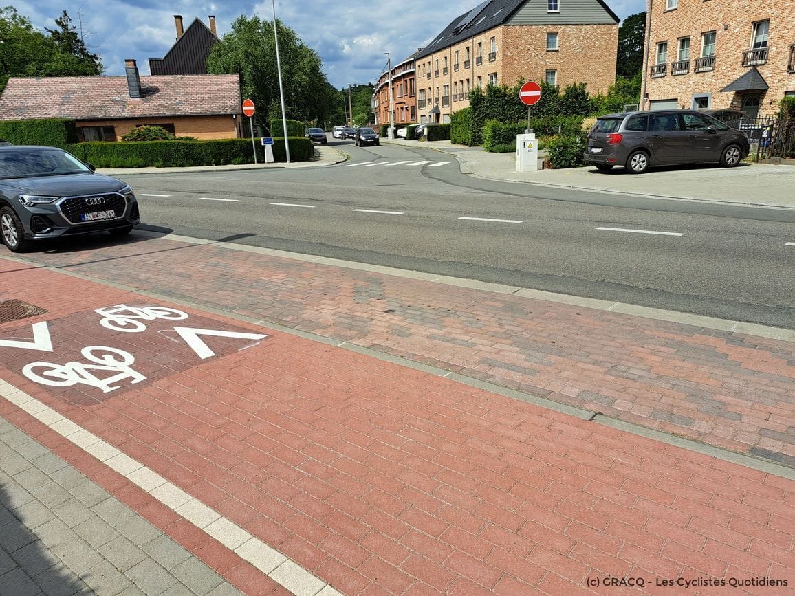 - Là où la piste cyclable est interrompue, ajouter une signalisation qui autorise le cycliste à rester sur son vélo (panneau « D10 » ou « zone piétonne avec logo vélo »). En effet, être obligé de pousser son vélo sur +/- 60m est très pénalisant, surtout avec un vélo équipé d’un siège enfant à l’arrière ou un vélo cargo bien chargé