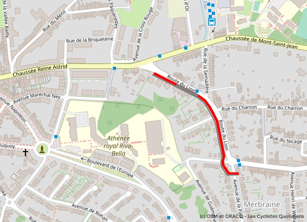 On peut déplorer également que cette « liaison » ne soit pas terminée puisqu’il n’y a pas d’accès à la Chaussée de Mont-Saint-Jean. Il faudra probablement attendre la création prochaine de la piste cyclable de la Chaussée de Mont-Saint-Jean pour que cette liaison soit matérialisée… tout en sachant déjà que cette future piste cyclable n’ira pas plus loin que la Rue de la Semaillère et donc pas jusqu’au Collège Cardinal Mercier.