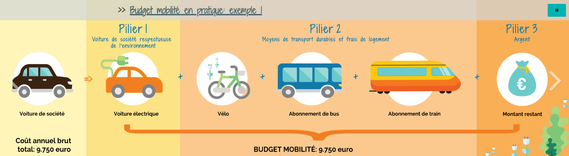 Pour tenter de juguler la croissance inexorable du nombre des voitures salaires dans les entreprises privées, le Parlement fédéral a créé en 2019 le budget mobilité. Celui-ci permet aux entreprises privées d’octroyer à (certains) salariés un budget pour se déplacer, se loger, voire même consacrer leur argent à autre chose. Cet outil est souvent présenté comme un bon complément à la voiture salaire. Car, théoriquement, l’employé·e peut dépenser son budget dans plusieurs enveloppes (piliers) autres que la voiture isolée, voire même ne plus opter pour la voiture du tout :